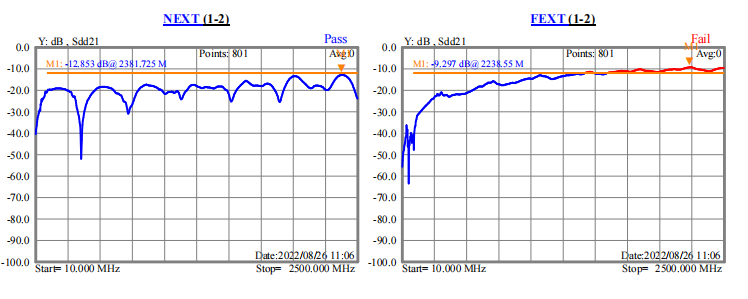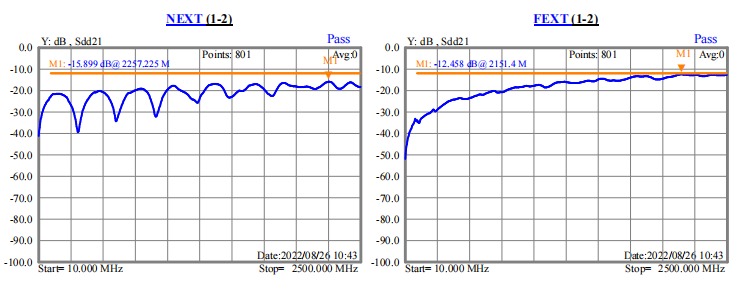 從圖一與圖二數(shù)據可以看出,不貼復合鋁箔,近串-12.8db,遠串-9.2db(如圖五);貼上復合鋁箔后,線纜的近串-15.9db,遠串-12.4db(如圖六)。因此,單面貼復合鋁箔比不貼復合鋁箔的串音效果更好。