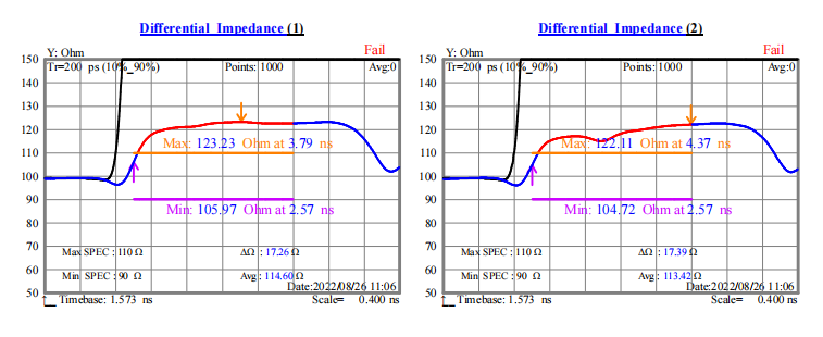 從圖一與圖二數(shù)據可以看出,不貼復合鋁箔,排線的特性阻抗平均值為114.6Ω和113.4Ω;貼上復合鋁箔后排線的特性阻抗平均值為96.8Ω和96Ω。而一般都要求線纜特性阻抗在100±10Ω。下圖七與圖八是不貼復合鋁箔與貼上復合鋁箔排線的特性阻抗圖,顯然貼上復合鋁箔后特性阻抗的波動范圍更小,且能控制在標準范圍內。